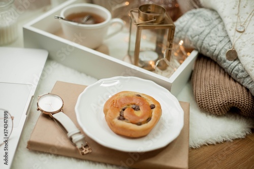 Breakfast. Laptop, mug of hot tea, bun, candle, eucalyptus in a vase. Cozy autumn. Home.