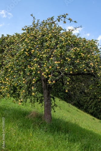 Alter reich Früchte tragender Apfelbaum in hanglage im Spätsommer