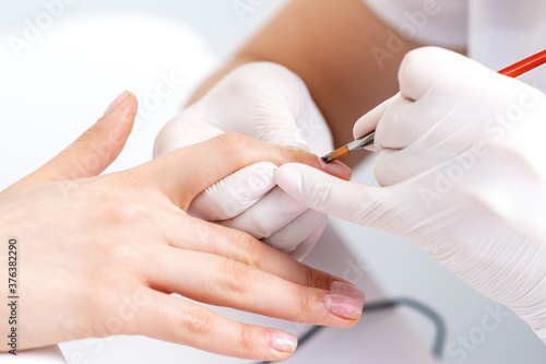 Close up of manicure master in rubber gloves applying transparent nail polish on female nails in beauty salon