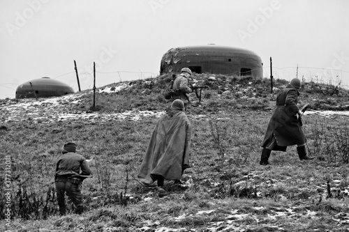 Żołnierze radzieccy przełamują pozycje umocnione wojsk niemieckich w drodze na Berlin zimą 1945 roku - rekonstrukcja historyczna