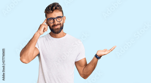 Young hispanic man wearing casual clothes and glasses confused and annoyed with open palm showing copy space and pointing finger to forehead. think about it.
