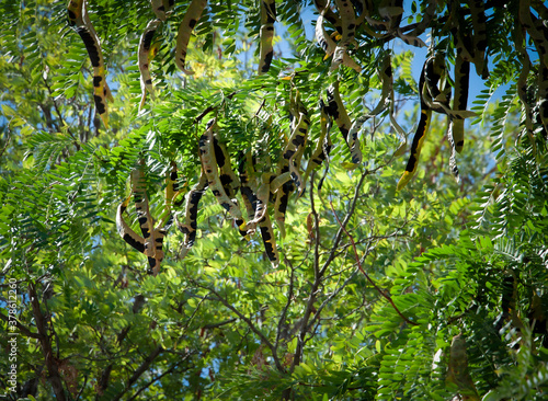 Drzewo karobowe Ceratonia siliqua z rozwijającymi się strąkami. Niedojrzały karob.