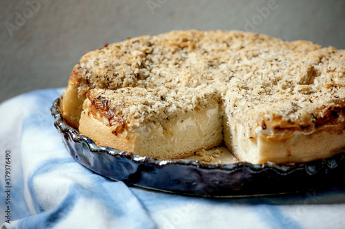 White sicilian focaccia. Traditional baked bread sliced cake with onion, herbs and cheese in ceramic dish served on blue and white tablecloth.