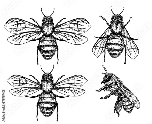 Bee sketch set. Honey bee vintage vector drawing. Hand drawn isolated insect sketch. Engraving style illustrations.
