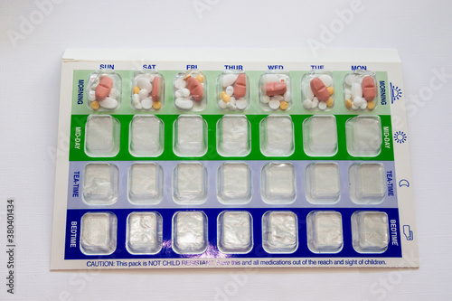 Blister or bubble pack for prescribed medication pills to assist taking at specified time of day. Tablets in individual sealed compartments bubbles