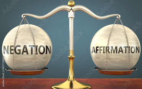 negation and affirmation staying in balance - pictured as a metal scale with weights and labels negation and affirmation to symbolize balance and symmetry of those concepts, 3d illustration