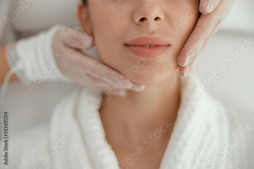 Beautiful healthy smiling caucasian woman is doing beauty procedures at spa and healthcare salon