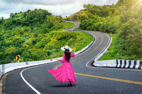 Woman walking on road no.3 or sky road over top of mountains with green jungle in Nan province, Thailand.