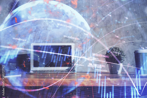Multi exposure of chart and financial info and work space with computer background. Concept of international online trading.