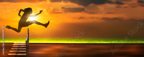 einzelner hürdenläufer als silhouette in aktion, symbol konzept für motivation herausforderung sport wettkampf gewinnen