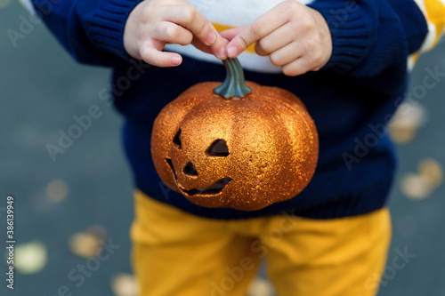 Kid's hands holding a toy pumpkin lantern for the holiday halloween