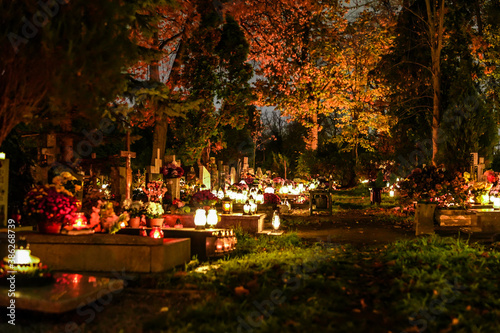 Christian cemetery with lit grave lights at night. Graveyard on All Saints' Day.