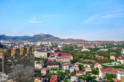 Panorama of resort town Sudak (Crimea) as it looks from top of Genoese fortress (part of it on left)