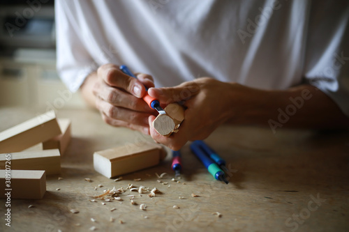 木材を削る男性の手元