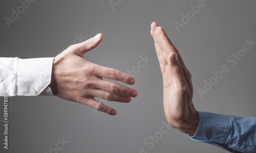 Man is refusing shake hand with businessman.