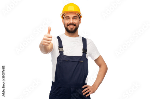 profession, construction and building - happy smiling male worker or builder in yellow helmet and overall showing thumbs up over white background