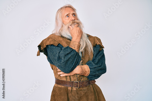 Old senior man with grey hair and long beard wearing viking traditional costume with hand on chin thinking about question, pensive expression. smiling with thoughtful face. doubt concept.