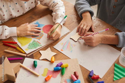 High angle close up of children tracing shapes while drawing Christmas cards in school, copy space