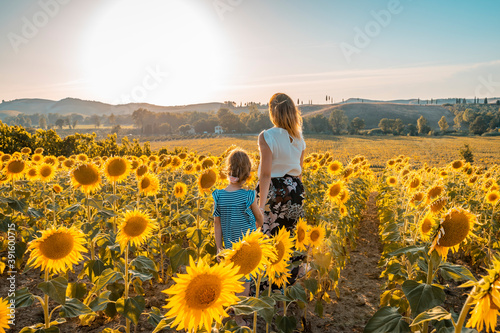 mamma e figlia si tengono per mano in un campo di girasoli al tramonto