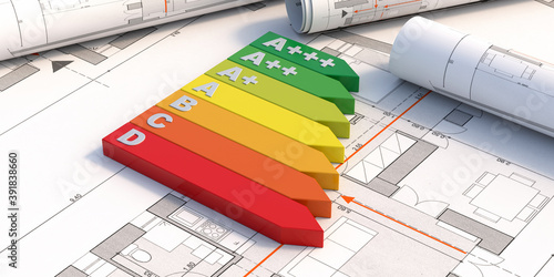 Energy efficiency rating chart on blueprint plans background. 3d illustration