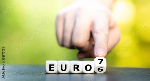 Symbol für die Änderung der Euro 6 Norm zur Euro 7 Norm. Hand dreht Würfel und ändert den Ausdruck "Euro 6" in "Euro 7".