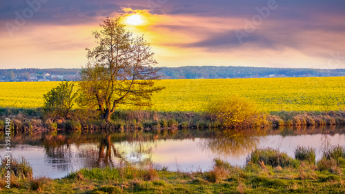 Spring landscape with a tree by the river and a yellow rapeseed field during sunset
