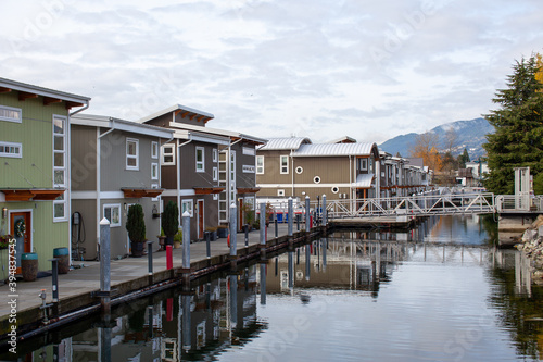 Cute, colourful floating houseboats line the docks in Mosquito Creek Marina, North Vancouver, British-Columbia. This alternative housing is growing in popularity with a challenging housing market.