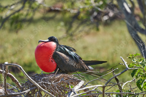 Magnificent frigatebird, Fregata magnificens, is a big black seabird with a characteristic red gular sac. Male frigate bird nesting with inflated sack, galapagos islands, Ecuador, South America
