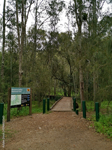 Beautiful view of a boardwalk hiking trail in the national park, Crosslands Reserve, Berowra Valley National Park, Sydney, New South Wales, Australia