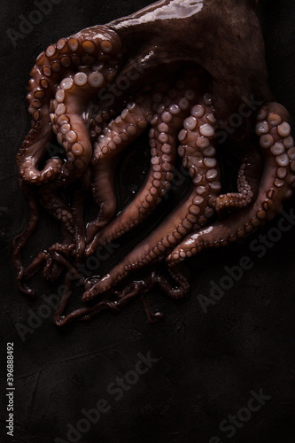 Octopus on a dark black background close-up. Seafood