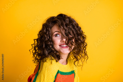 Photo of sweet adorable lady wearing casual colorful sweater looking empty space isolated yellow color background