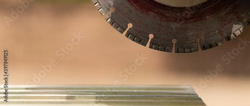 Die Zähne von einer wassergekühlten Kreissäge, Motorsäge für Betonplatten, Steine schneiden im Wasserbad