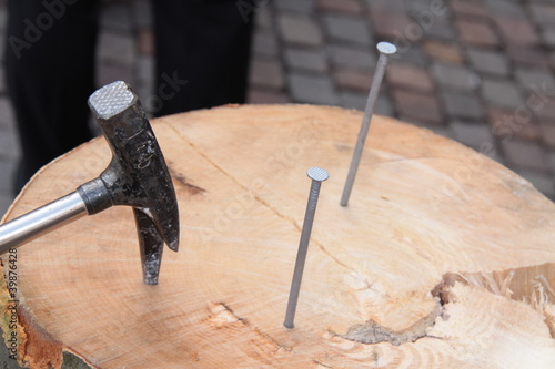 Nagel auf den Kopf oder Nagelprobe mit Zimmermannshammer und Nägel mit Köpfen