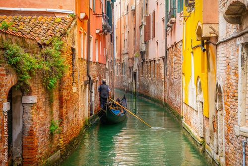 Venetian gondolier punting gondola through green canal waters of Venice Italy
