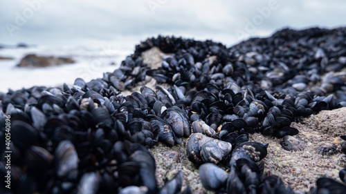 Mussels covering rocks on the beach in winter. Low angle closeup. Shallow depth of field.