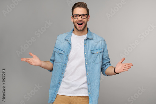 Portrait of young handsome caucasian man in jeans shirt over light background