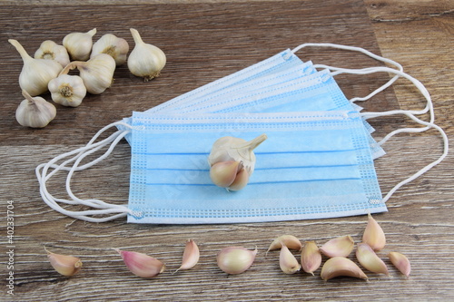 Czosnek na maskach medycznych ochronnych drewniane tło, ochrona przed infekcją