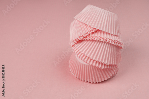 Colorful hot pink paper cups for baking muffins or muffins on pink background, copy space