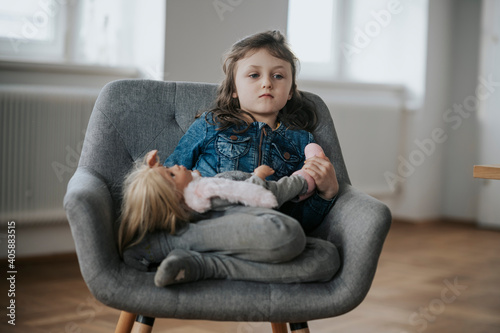 Trauriges Mädchen mit Puppe sitzt in einem Stuhl