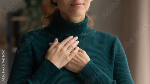 Crop close up of Caucasian woman hold hands in prayer at heart chest feel religious superstitious. Young female believer being grateful thankful pray to God. Faith, belief, religion concept.