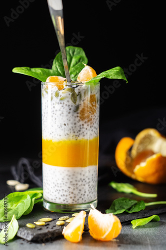 Mandarin, spinach and banana chia pudding with almond milk