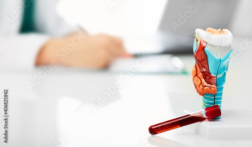 Thyroid anatomical model and thyroid hormone blood test tube on the endocrinologist's table, close-up, soft focus