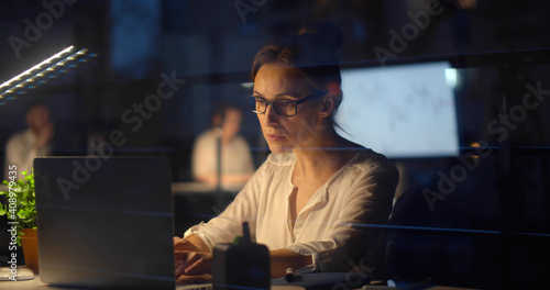 Young businesswoman working on computer in office at night.