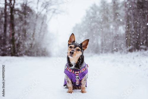 Black dog mutt in clothes in winter wonderland. Czarny pies kundelek w ubranku i zima.