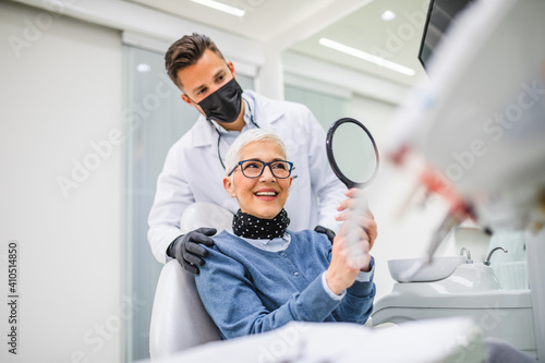 Beautiful senior woman having dental treatment at dentist's office. Dentist is wearing protective face mask due to coronavirus pandemic..