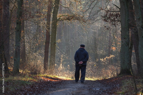 Człowiek idący po drodze w lesie wśród wysokich drzew