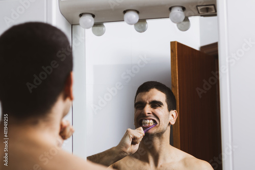 young man brushing his teeth with a toothbrush in the bathroom at home