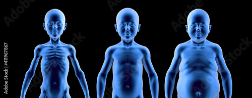 Undernourished child, with normal build and obese child in comparison. Problems of food shortage and obesity in children. 3d render