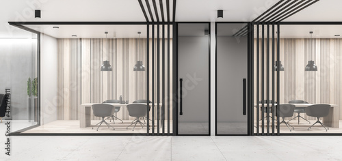 Meeting rooms with glass walls, stylish black furniture, big round lamps above the table and wooden floor. 3D rendering