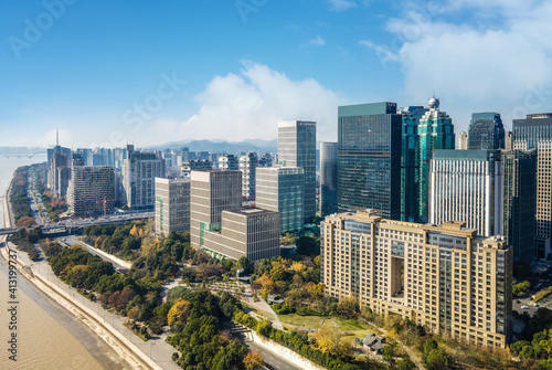 Aerial photography of Hangzhou city scenery and modern architectural landscape in the financial district